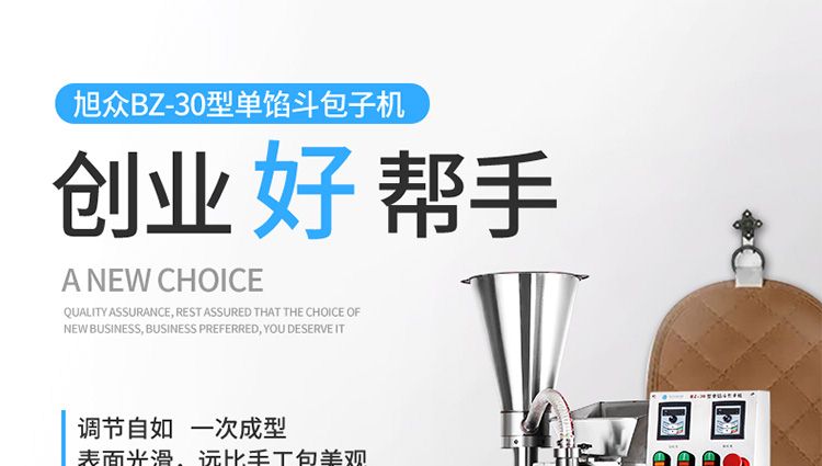 ◆ 旭眾牌BZ-30全自動小型包子機(jī)采用雙變頻控制,面、餡大小調(diào)節(jié)自如、使用方便。產(chǎn)品一次成型,所出產(chǎn)品外形大小統(tǒng)一、表面光滑、花紋整齊,遠(yuǎn)比手工包美觀。