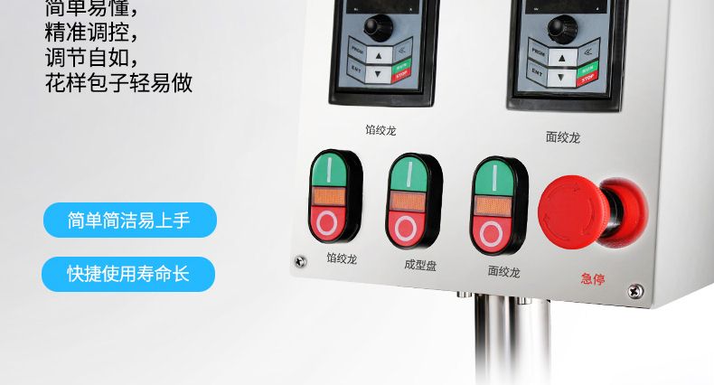 ◆ 本機(jī)采用雙絞龍送面、變頻無級調(diào)速,包子大小、出面出餡均可任意調(diào)節(jié),出面均勻、出面暢通、不傷面筋、不斷面筋,出餡系統(tǒng)優(yōu)點:餡管不會掉餡,不會出現(xiàn)空包子,出餡速度快,壓力小,均勻,適合各種不同的餡料。解決了普通包子機(jī)菜餡走不穩(wěn)的問題。