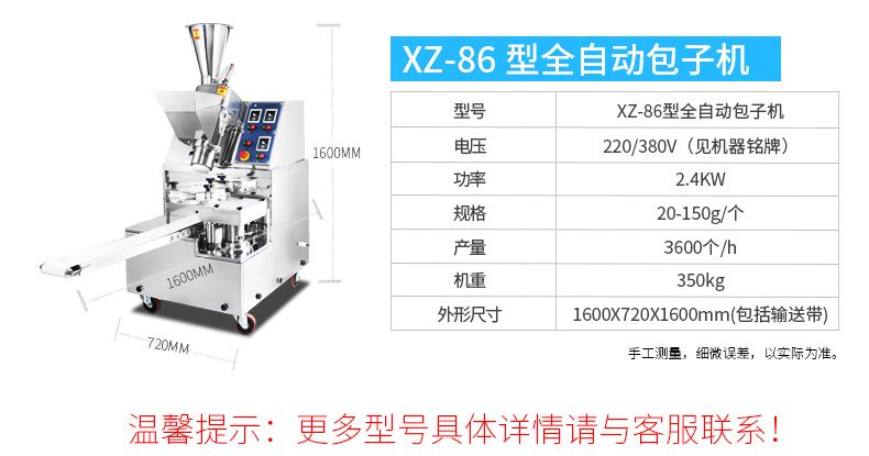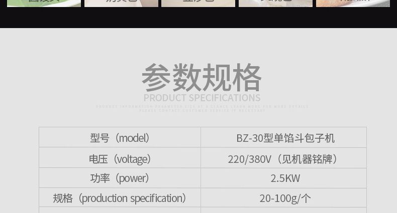 名稱BZ-30型單餡斗包子機(jī) 電源220/380V(見機(jī)器名牌) 功率2.5kw 產(chǎn)量1800個/小時 尺寸1440*680*1470mm 重量300kg 規(guī)格25-100克/個 其他
