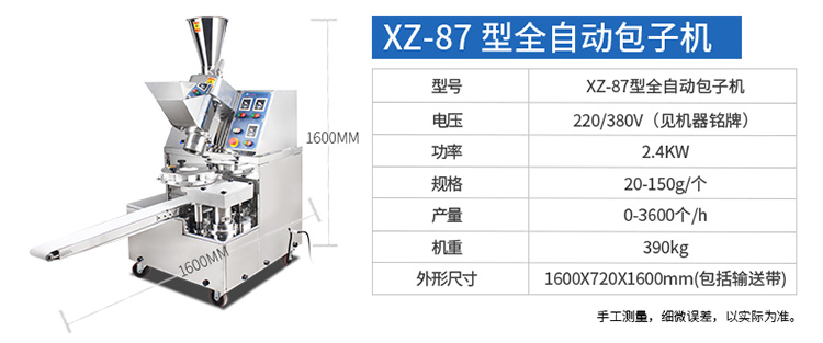 XZ-86型全自動包子機,可生產各種肉包、菜包、肉菜包、小籠包、湯包、水晶包、圓饅頭、奶黃包、豆沙包、叉燒包、南瓜餅、煎堆等十幾種包餡制品。適用于賓館、飯店、學校、機關企業(yè)食堂、饅頭或包子加工廠、早餐工程店及速凍食品廠等單位。可滿足不同客戶群體。免費提供工藝技術。免費上門培訓指導安裝。