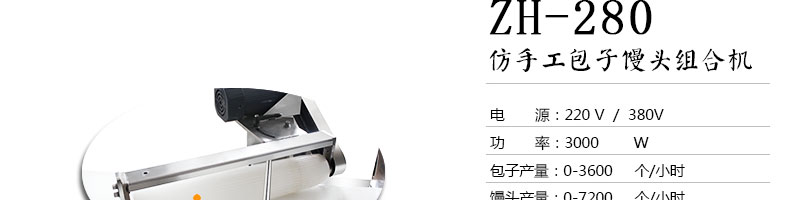 名稱ZH-280型仿人工卷面式包子饅頭機 電源220/380V(見機器名牌) 功率3kw 產量包子0-3600個/小時,饅頭2000-7200個/小時 尺寸主機尺寸4100*725*1520mm,成型機尺寸1490*870*830mm,出餡機尺寸870*4 重量450+110+170kg 規(guī)格包子25-150克/個,饅頭10-200克/個 其他三段壓面
