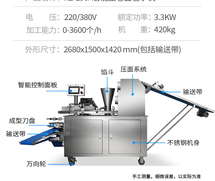 ◆壓面、成型、出餡、切刀一體化,操作方便,生產(chǎn)效率高,占地面積小。