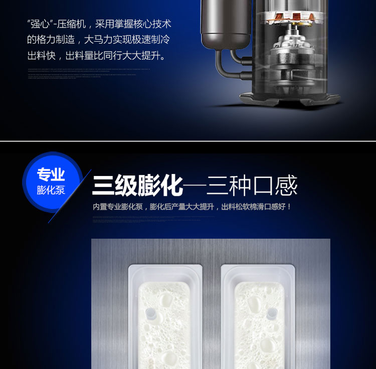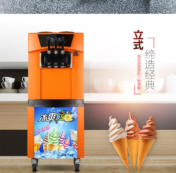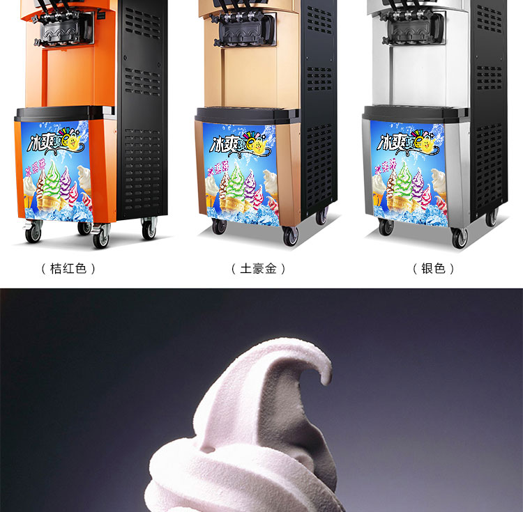名稱BQL-928冰淇淋機(jī) 電源220V 功率2.3kw 產(chǎn)量20-30L/h 尺寸540×676×1360mm 重量118kg 規(guī)格 其他顏色:銀色,桔色,土豪金