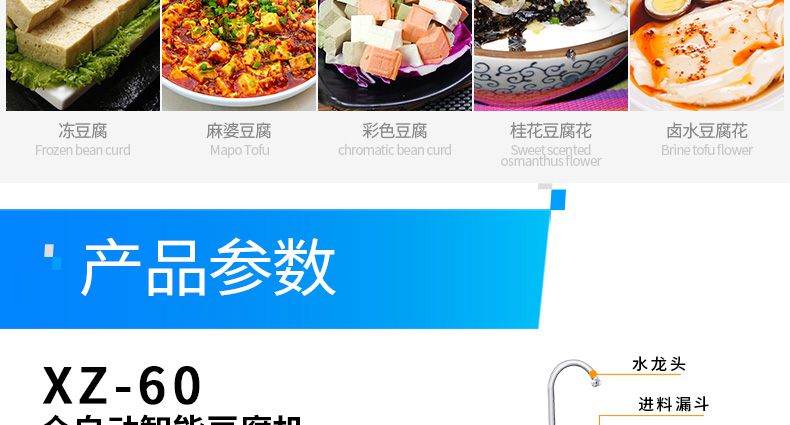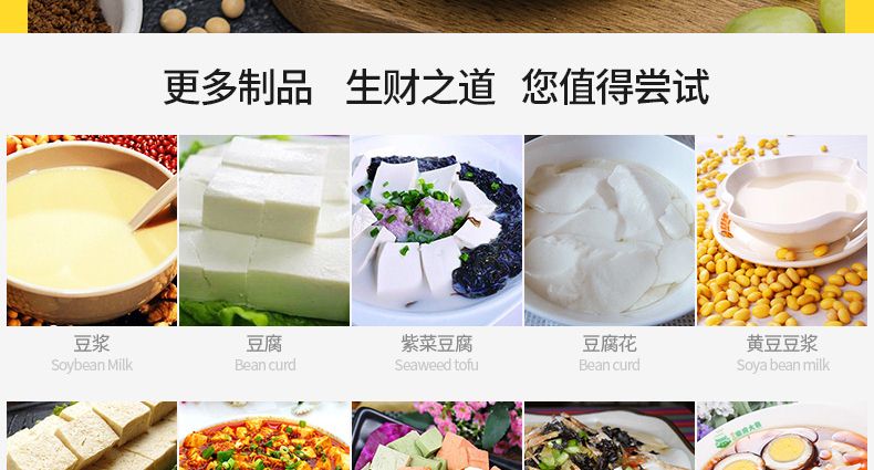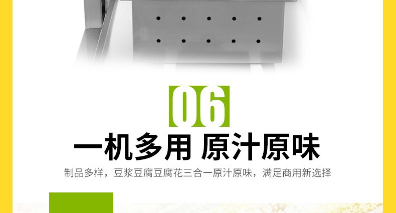 全自動(dòng)豆腐機(jī)系列,一機(jī)多用:可生產(chǎn)豆腐系列產(chǎn)品:?jiǎn)紊郏希┒垢?、多彩?腐、單色豆腐皮、多色豆腐皮、彩色豆腐干、豆?jié){、豆花等豆制品制作,還可以與其他設(shè)備和工藝配套生 產(chǎn)更多的豆制品。
