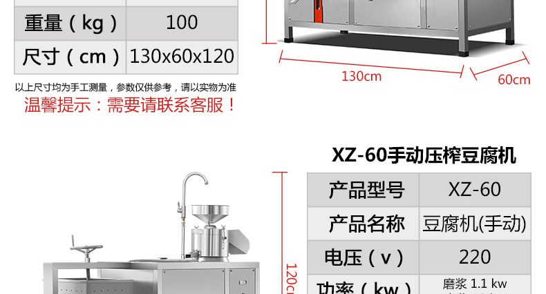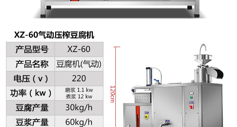 名稱全自動(dòng)豆腐機(jī)系列 電源220V 功率13.1kw 產(chǎn)量豆?jié){產(chǎn)量120斤/h;豆腐產(chǎn)量60斤/h 尺寸600×1300×1200mm 重量 規(guī)格 其他
