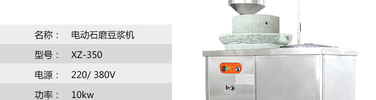 名稱XZ-350電動石磨豆?jié){機 電源220/380V 功率10kw 產(chǎn)量30kg/h 尺寸1000*550*1100mm 重量 規(guī)格 其他