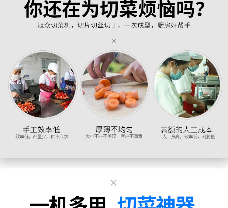1、一機(jī)多用,可切葉菜切片、絲、段等。