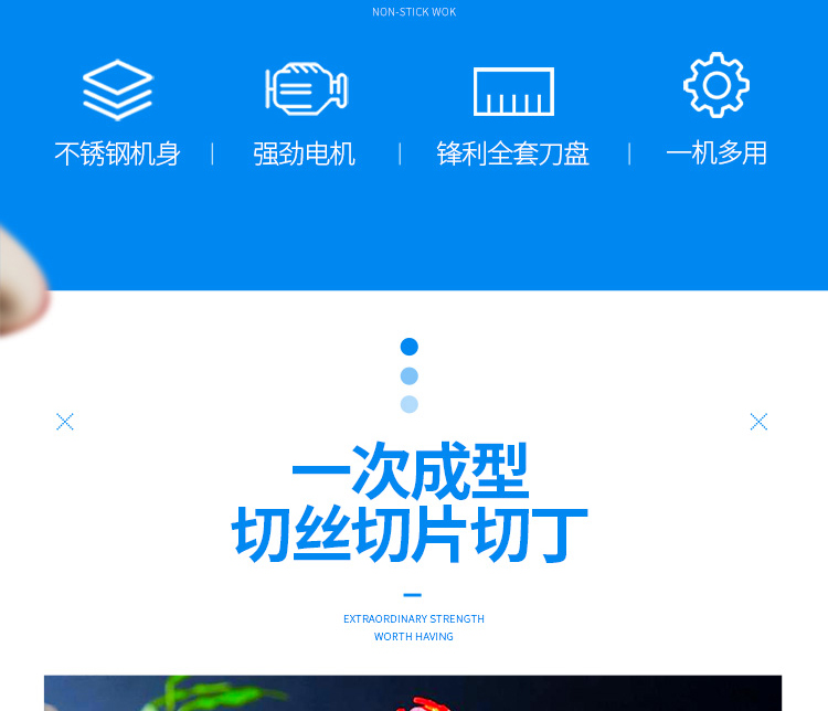1、一機多用,根莖類蔬菜,并可切片、絲、條、丁、段等。
