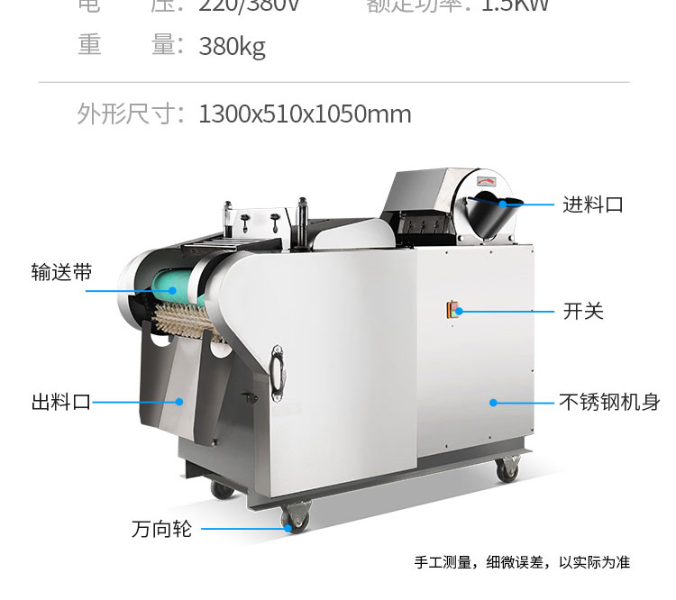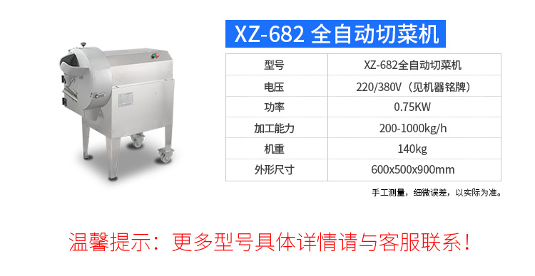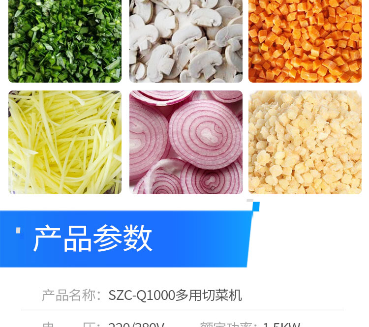 名稱SZC-QJ660/Q1000小型多功能切菜機(jī) 電源220/380V(見機(jī)器銘牌) 功率1.5kw 產(chǎn)量200-1000千克/小時(shí) 尺寸1300*510*1050mm 重量380kg 規(guī)格 其他