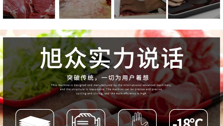 5.旭眾牛羊肉切片機(jī)憑借其外觀,高效率加工能力,簡(jiǎn)單的操作,及超低的故障率,備受廣大客戶的好評(píng),成型美觀