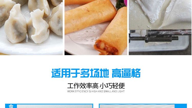 ?一機多用:只要更換模具,就可以制造不同的食品,如春卷、餛飩等,面皮厚度與餡量可調(diào)整;