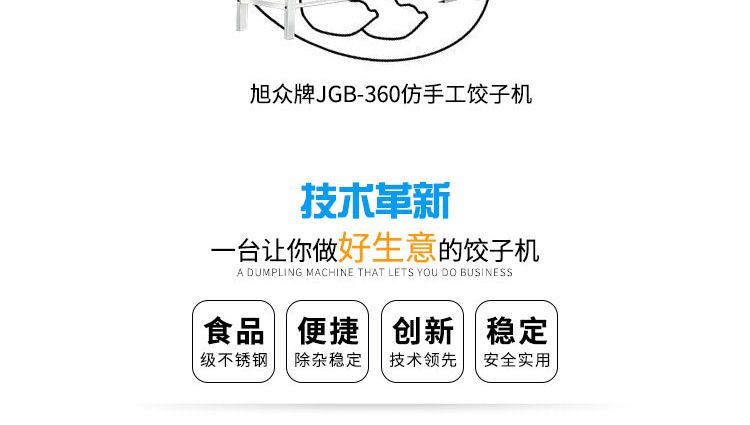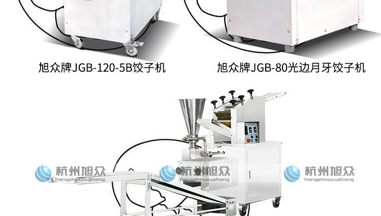 旭眾牌JGB-120-5A型輸送帶餃子機是一款可生產(chǎn)各種肉餡、肉菜混合餡、全菜餡及其它種餡餃子的設(shè)備。完美的設(shè)計,兼顧衛(wèi)生與美觀兩大優(yōu)點,并且拆裝容易,清洗簡便。