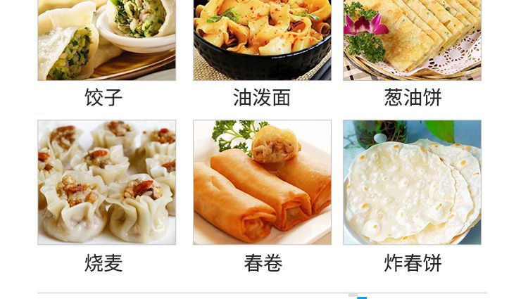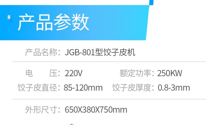 名稱JGB-801型餃子皮機(jī) 電源220V 功率250W 產(chǎn)量0-3800個(gè)/h 尺寸650×380×750mm 重量45kg 規(guī)格0.8-3mm厚度 其他