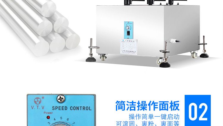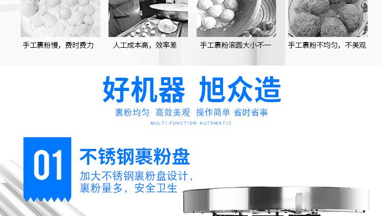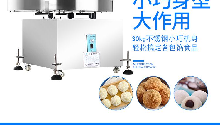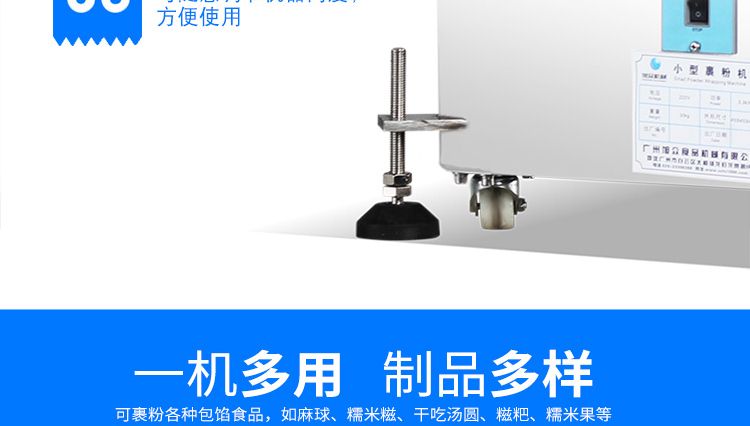小型裹粉機(jī)用于裹芝麻、麻薯、糯米糍、干吃湯圓等熟糯米制品裹粉滾圓。