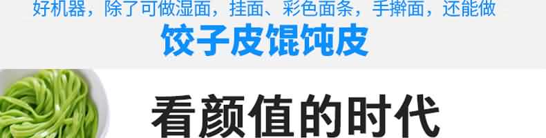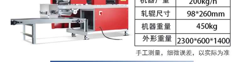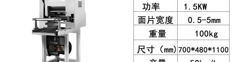 名稱MTJ30臺式面條機 電源 功率0.55kw 產(chǎn)量30kg/h 尺寸650×500×350mm 重量45kg 規(guī)格面片寬度200mm面片厚度0.5-4mm 其他