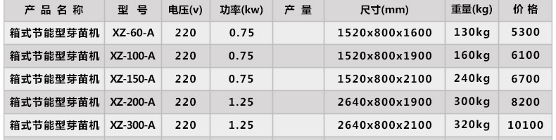 型號工作電壓耗水量日耗電(度)功率育苗箱重量外形尺寸