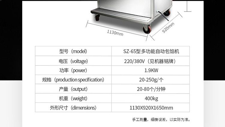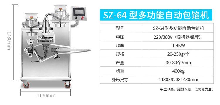名稱SZ-65型多功能包餡機(jī) 電源220/380V 功率1.9kw 產(chǎn)量20-80個(gè)/分鐘 尺寸1130×920×1650mm 重量400kg 規(guī)格20-250克/個(gè) 其他皮餡比例2:8 5:5