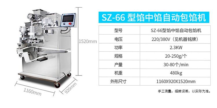 SZ-65型多功能包餡機(jī),可生產(chǎn)豆沙、蓮蓉、五仁餡等較干餡料的包餡類產(chǎn)品,制出的產(chǎn)品餡、皮比例可任意調(diào)整,制品大小統(tǒng)一,外形美觀。