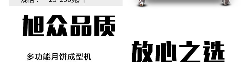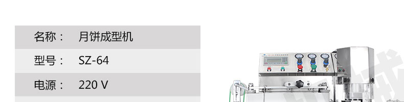 名稱SZ-64月餅自動成型機 電源220V 功率0.4kw 產(chǎn)量20-80個/分鐘 尺寸1760×530×1045mm 重量200kg 規(guī)格φ15-100mm 其他