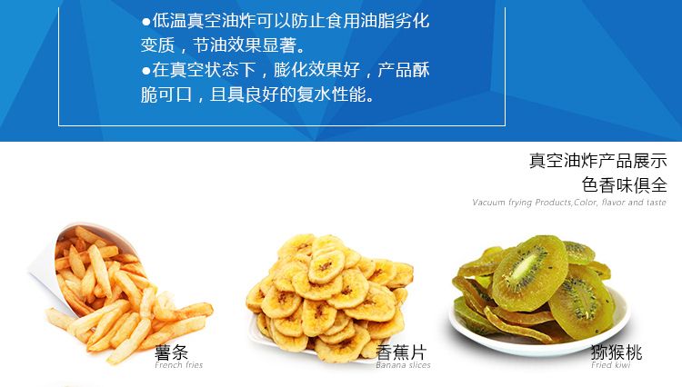 ●真空油炸是在低溫(80~120℃)對食品進(jìn)行油炸、脫水,可以有效地減少高溫對食品營養(yǎng)成分的破壞。